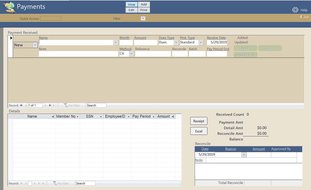 - Track dues by pay period and received dates